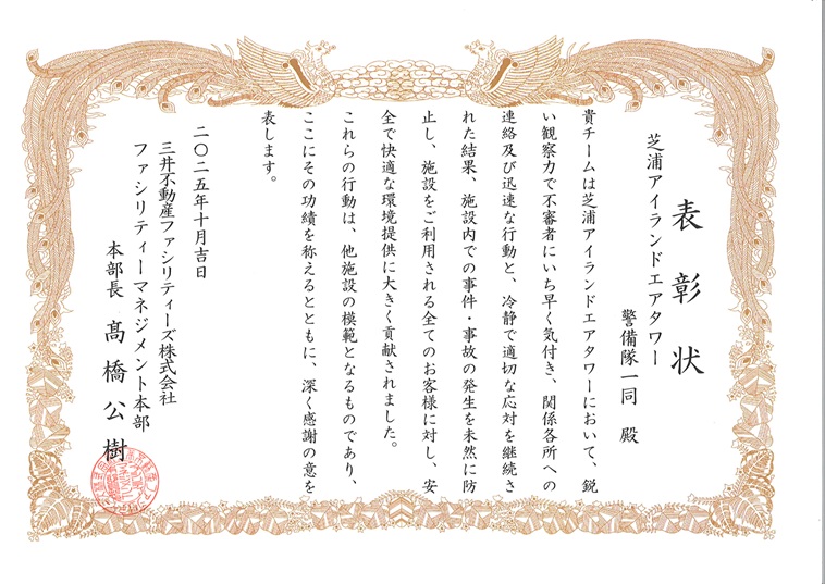 三井不動産ファシリティーズ株式会社様より表彰状を頂戴しました